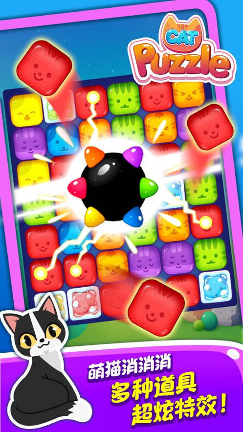 游戏的核心玩法是通过点击消除两个或两个以上相同颜色的方块来完成关卡任务。每一关都设有独特的目标,玩家需要运用策略和技巧来顺利通关。游戏中的猫咪角色设计萌趣十足,搭配色彩缤纷的画面和多样化的游戏模式,为玩家带来视觉与操作的双重享受。此外,游戏还设置了丰富的挑战关卡,难度逐步提升,让玩家在轻松娱乐的同时也能感受到刺激与成就感。
