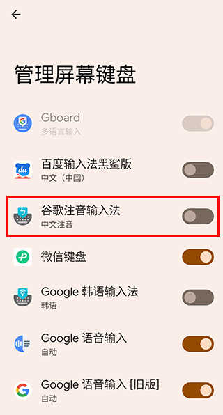 接着来到虚拟键盘管理界面后,找到并启用谷歌注音输入法