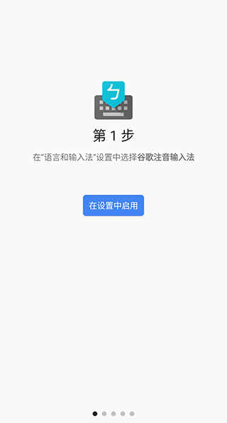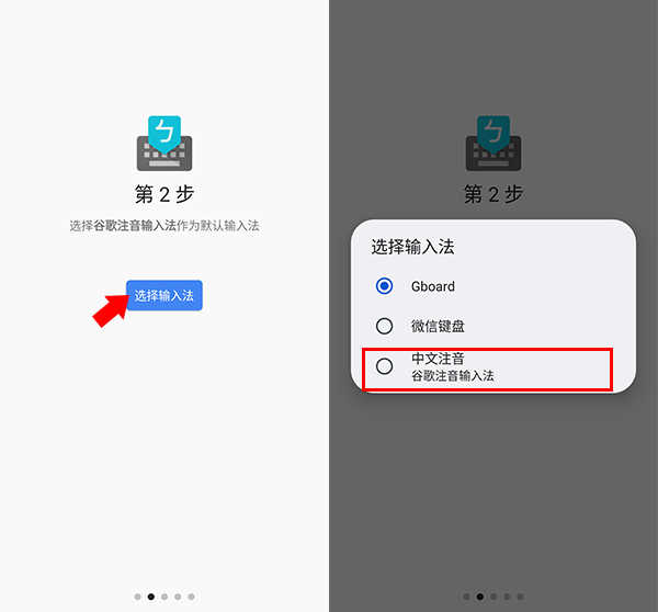 之后返回引导界面,按照提示点击选择输入法,并在打开的弹窗中选择中文注音(谷歌注音输入法)