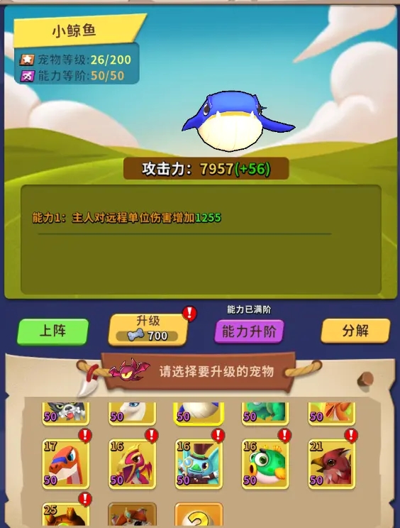 宠物的初始攻击力是相同的,通过升级宠物提升宠物攻击力