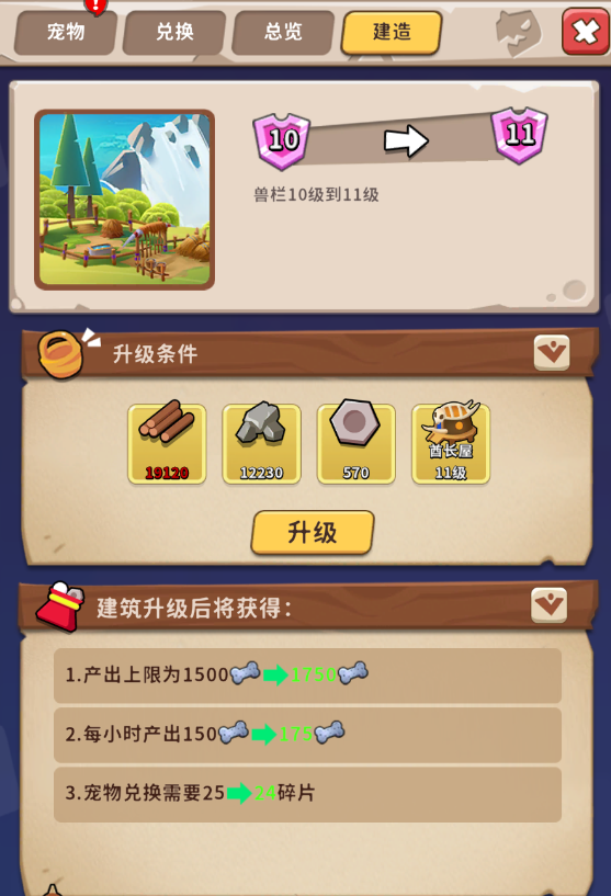 木材、石材和石币用来升级兽栏建筑,每升一级产出的兽粮增长,产出材料可用于宠物升级