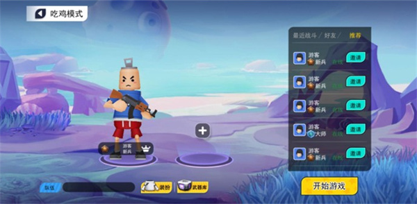 下载安装好拉罐大作战2023最新版本,运行游戏,选择吃鸡模式,游戏中还有其他的游戏模式,开始匹配;