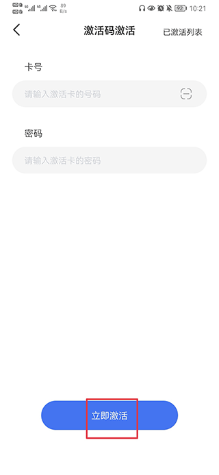 二、将激活卡的号码以及密码填写完成后点击立即激活即可