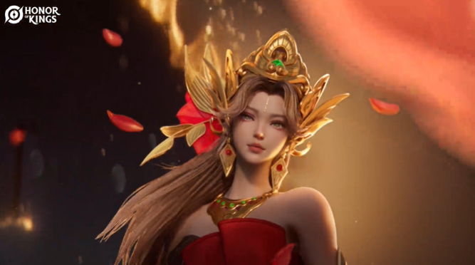 甄姬头戴以马来西亚国花「木槿花」为核心的饰品,金丝薄纱轻曳,尊贵与生机在她发间绽放!