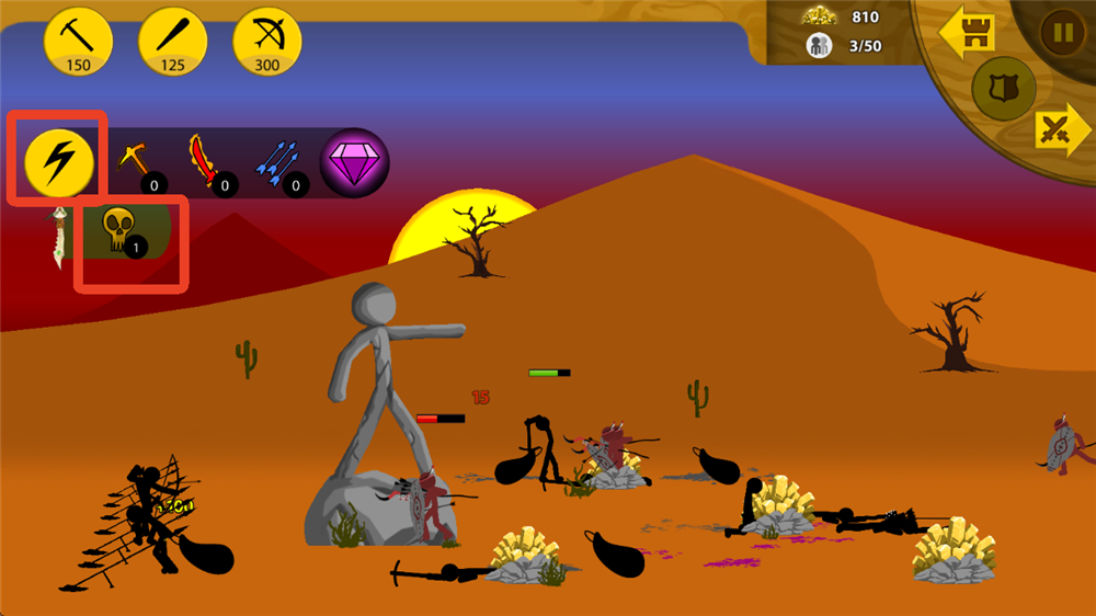 购买成功后可以点击战场上左边闪电形状的按钮,然后再选择底下黄色骷髅。